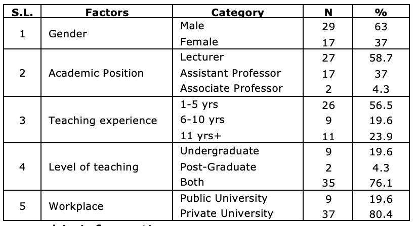 The participants of the study consisted of 46 university teachers who were teaching English as a foreign language at twelve different public and private universities located in Dhaka, Sylhet, and Bogra in Bangladesh. The participants were selected by employing a purposive sampling technique. Hard copies of the questionnaire were distributed among them for them to fill out. The researchers got permission for conducting survey and interview among teachers from the Dean or head of the schools under investigation and participants took part in the study voluntarily after signing the consent forms. The responses were collected from June to August 2019. The demographic information is presented in Table 1. Out of the 46 participants, 29 were male (63%), and 17 were female (37%). The participants who participated in this study held different academic position at the respective schools, such as lecturer (58.7%), assistant professor (37%), and associate professor (4.3%). The participants had experience in teaching English at undergraduate (19.7%), post-graduate level (4.3%), and both levels (76%). The participants worked at private universities (80.4%) and public universities (19.6%).