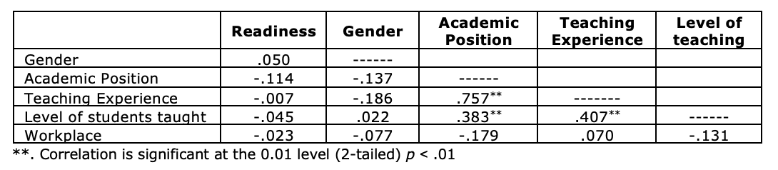 In order to examine the relationship between the demographics and readiness, an inferential statistic calculation using Pearson Correlation was carried out to identify the relationship between demographic factors, such as gender, academic position, teaching experience, level of students taught, and workplace, and the EFL teachers' readiness to use technology in their teaching. In other words, a two-tailed Pearson correlation was performed, and results are presented in Table 4.