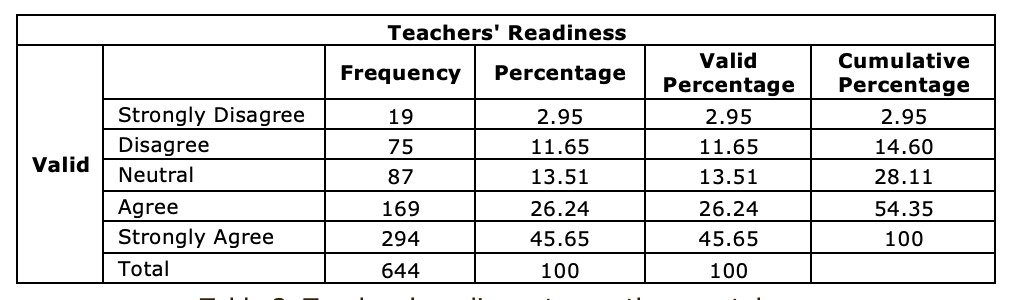 Table 3 presents the descriptive item analysis of the teachers' readiness scale of using a smartphone for teaching OECSs. 'Neutral' was treated as a midpoint (3), and the mean value higher than three (3) was considered that participants had a high-level of readiness.