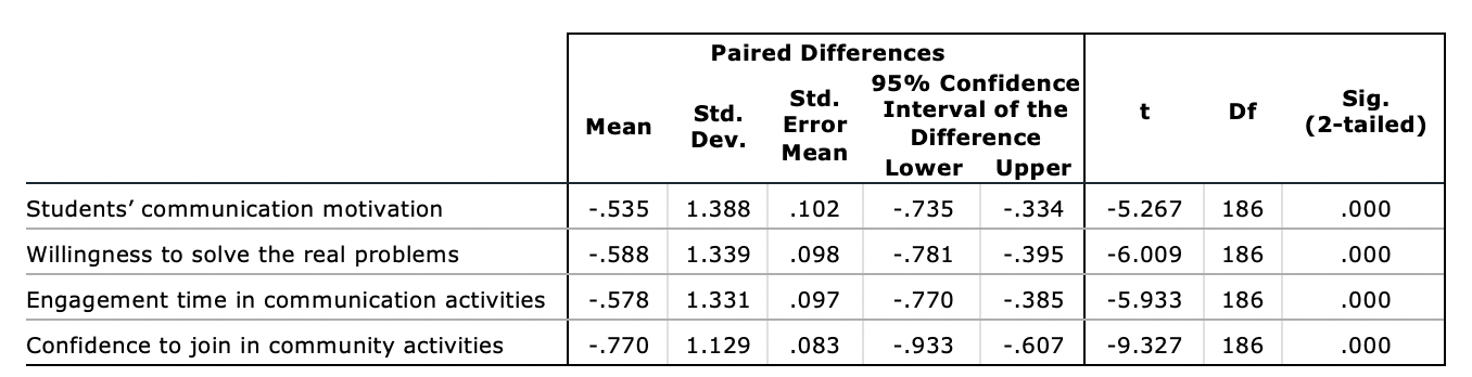 A paired-sample t-test was used to examine and evaluate the difference between the effects of IT-assisted reflective activities before and after their implementation. Regarding student learning motivation, a hypothesis was proposed: there is no difference in student communication performance before and after the implementation of IT-assisted reflective activities.