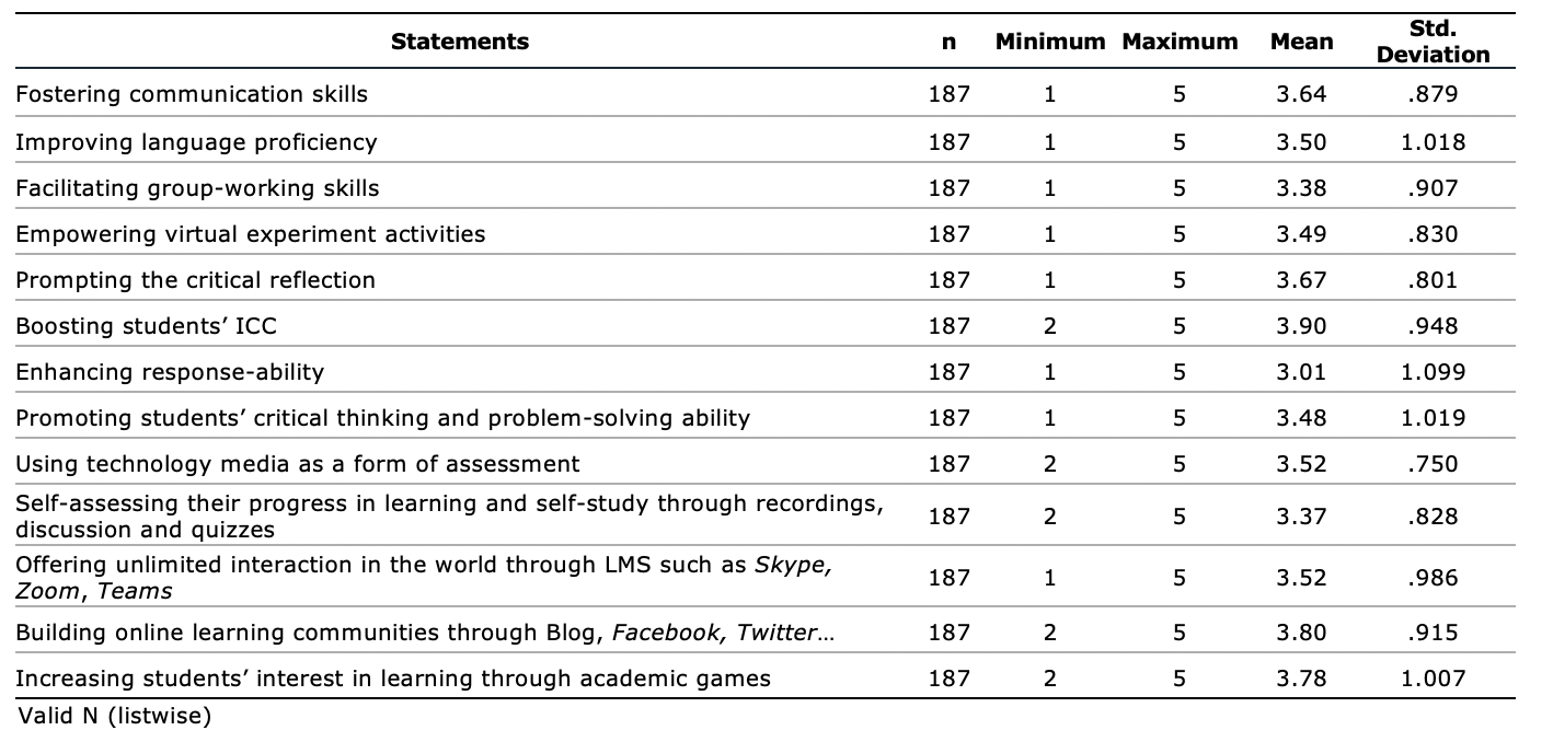 The quantitative data were analyzed with the assistance of using IBM SPSS 25.0 software with the assistance of descriptive statistics. The demographic information of the participants was analyzed using frequency descriptive tests. Mean and standard deviation values of students' evaluations regarding the significance of using IT-assisted reflection activities in foreign language learning were calculated using statistical descriptive formulas. The correlation between using IT-assisted reflection activities and factors such as learning motivation engagement time in communication activities, willingness to solve real problems, and confidence to participate in community activities was examined using Paired-sample T-tests.