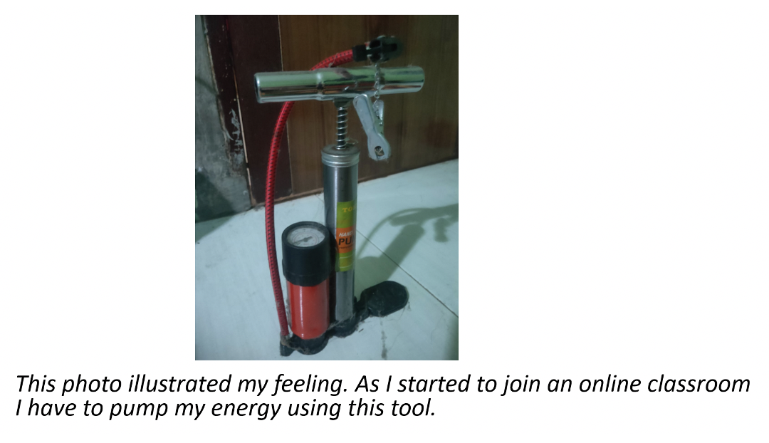 The photovoice presented above expresses Andi’s enthusiasm in joining the OCLP as it indicates that he struggled to cope with his problems in joining the online class. Andi illustrated his feeling by using a set of carpentry tool such as pliers and screwdriver, and a construction tool like vibrator. It indicates that Andi shows his desire to learn and organize his group member on his own way. To fulfil his need to join an online classroom, he had to have a sufficiently large internet quota to communicate with them as shown in his comments below: