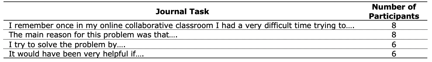 Of a total of 64 participants who were in the course, six participants were actively involved in the synchronous discussion and accomplished writing journals 1 and 2. However, there were only two participants who wished to take part in this present study and perform a narrative interview through voice notes. Table 1 demonstrates the number of participants who accomplished the journal task.