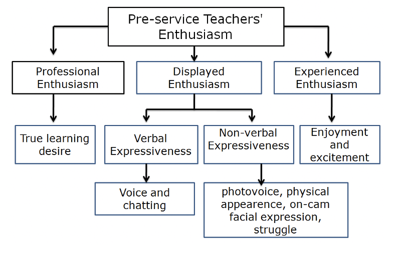 In this study, the integration of professional enthusiasm (e.g., true learning desire) (Utami et al., 2019), displayed enthusiasm that consists of verbal expressiveness (e.g., voice and chatting) and non-verbal expressiveness (e.g., photovoice, physical appearance, on-cam facial expression, struggles), and experienced enthusiasm (e.g., enjoyment and excitement) (Keller et al., 2016) are handled as elements of a framework for PsTs’ enthusiasm as learners.