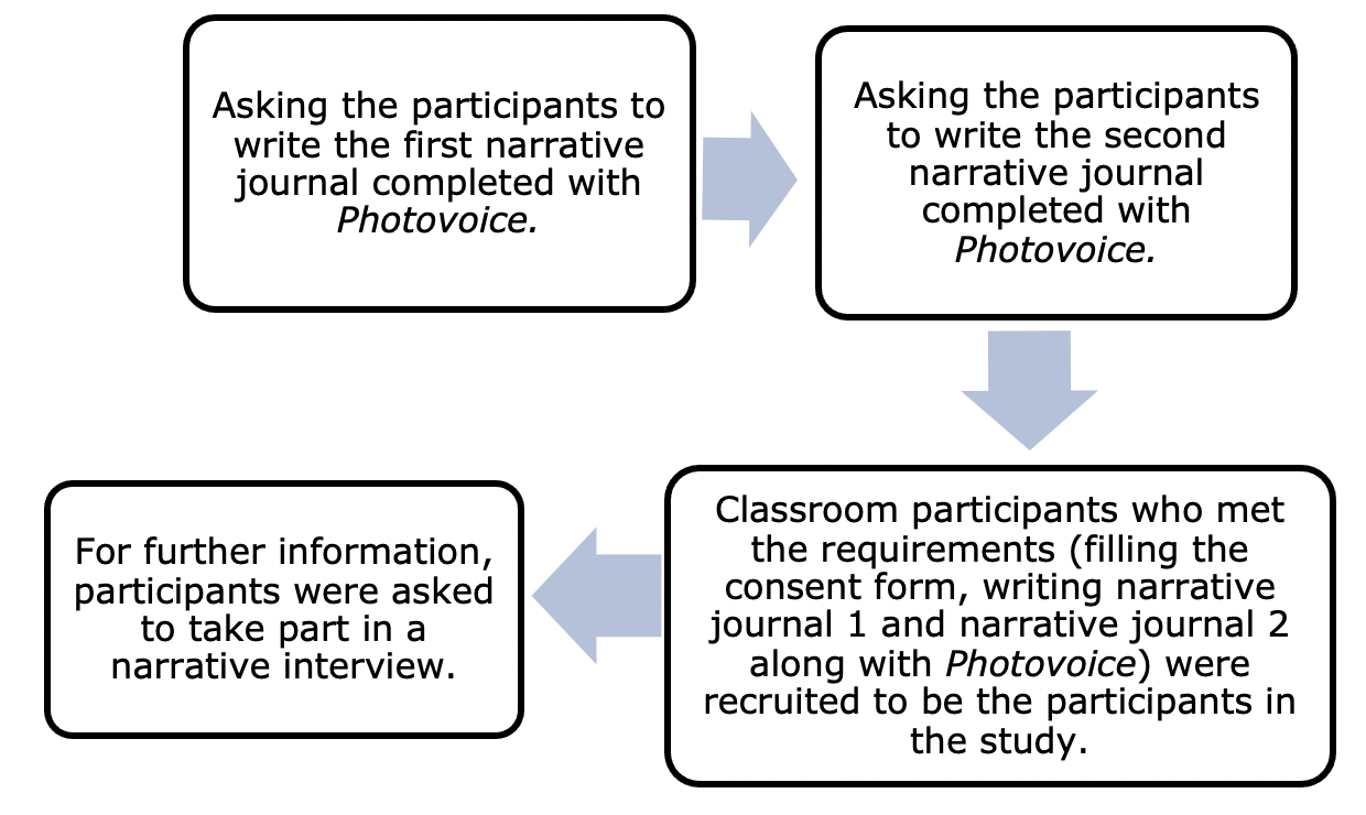 As shown in Figure 2, the data collection procedure included four stages: writing the first narrative journal, writing the second narrative journal, making a photovoice, and performing a narrative interview.