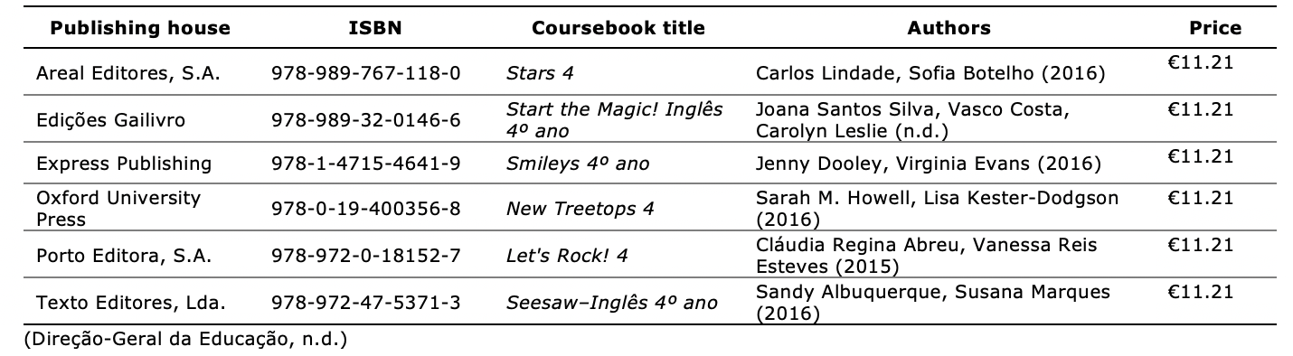 Direção Geral da Educação (n.d.). Lista de manuais escolares disponíveis [List of available textbooks]. https://www.dge.mec.pt/lista-de-manuais-escolares-disponiveis