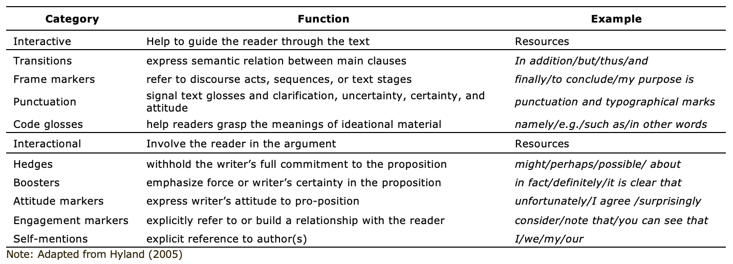 Hyland, K., & Tse, P. (2004). Metadiscourse in academic writing: A reappraisal. Applied Linguistics, 25(2), 156-177. https://doi.org/10.1093/applin/25.2.156