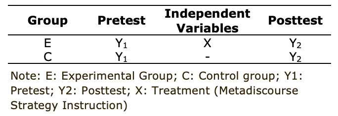 The study was conducted with two groups of subjects: the experimental group (EG) and the control group (CG). The EG received instruction on metadiscoursal features of expository texts following Hyland’s (2005) modified model of interpersonal metadiscourse. Students’ scores on a reading comprehension test (developed to assess students’ metadiscourse knowledge) were the dependent variable, and instruction of metadiscoursal features were the independent variable. A widely used quasi-experimental design in educational research, namely a nonrandomized control group, pretest-posttest design was used in this study (Ary et al., 2009), as presented in Table 2 below. To meet ethical standards, we asked the participants to sign a consent form, which involved expressing their agreement to participate in the study and that the data would only be used for research purposes.