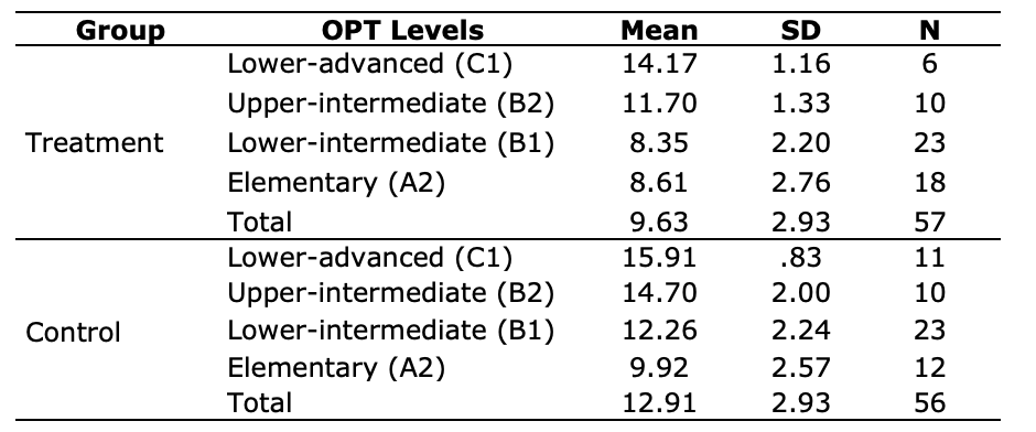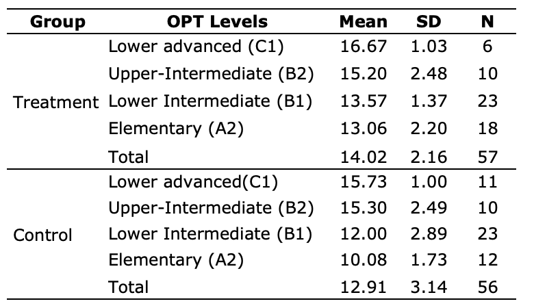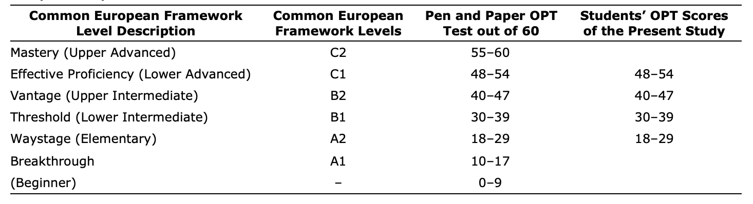 Table 3: The Oxford Placement Test scores mapped onto the Common European Framework of Reference.