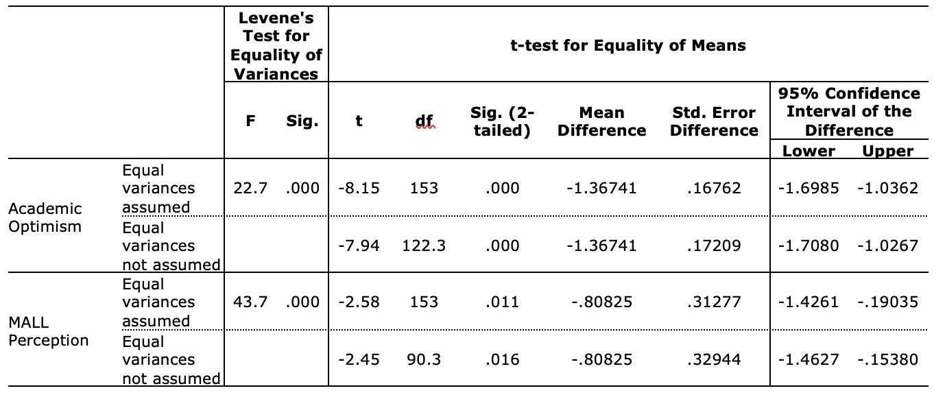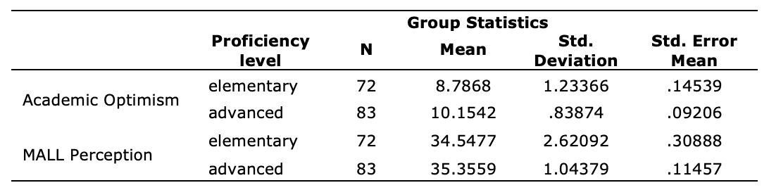 The results of descriptive statistics for the high and low proficiency EFL learners’ AO and their perceptions towards MALL are represented in Table 1. With respect to AO, the low proficiency participants had a mean value of 8.78 (SD =1.23), and high proficiency participants had a mean value of 10.15 (SD=0.84). For perceptions towards MALL in listening comprehension, the low proficiency group had a mean value of 34.55 (SD =2.62), and the high proficiency had a mean value of 35.36 (SD =1.04). Overall, participants in the high proficiency level reported higher level of academic optimism and had positive perceptions towards MALL.