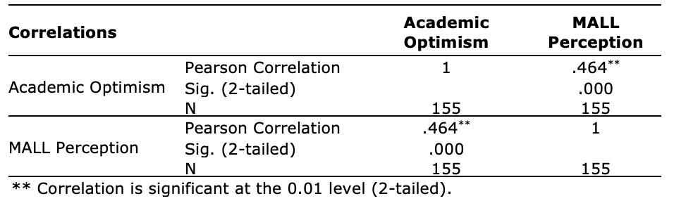 Furthermore, the relationship between AO and MALL perceptions was investigated using Pearson product-moment correlation coefficient. Before running the test, the assumptions of normality, linearity, and homoscedasticity of the scores were checked and no violation was observed. The results indicated that there is a significant medium, positive correlation between the two variables (r = 0.464, n = 155, p = 0.000), with high scores on AO associated with more positive perceptions towards MALL (Table 3).